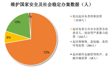 ——扛牢扛实检察责任,维护国家安全稳定。坚定不移贯彻总体国家安全观,全力做好检察环节保安全、护稳定各项工作。依法批捕各类刑事犯罪276人、起诉1119人。严厉打击危害公共安全犯罪及故意杀人、抢劫等严重暴力犯罪,起诉116人。突出惩治黄赌毒、盗抢骗、食药环等犯罪,起诉294人。维护金融安全稳定,起诉破坏金融管理秩序、金融诈骗犯罪18人,监督追缴不良资产2500余万元,严防金融风险演化为政治社会风险。