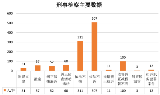 ——以“求极致”精神推动刑事检察取得新进步。履行刑事诉讼主导责任,依法惩治犯罪、保障人权。在全省率先成立侦查监督与协作配合办公室,监督立案31件、撤案57件,纠正漏捕漏诉52人,纠正侦查活动违法60件。全面落实“少捕慎诉慎押”刑事司法政策,依法不捕311人、不诉507人。加强审判活动监督,检察长列席审委会13次,提请提出抗诉11件。强化刑事执行监督,监督纠正减假暂不当100件。开展监管场所、社区矫正巡回检察,发现并纠正脱漏管3人、执法不规范问题48个。积极参与反腐败斗争,提前介入职务犯罪案件15件,起诉12人。民勤县检察院办理的一起假冒注册商标案,入选全省检察机关种业司法保护典型案例。